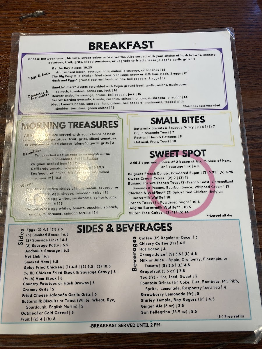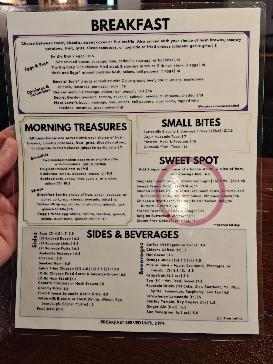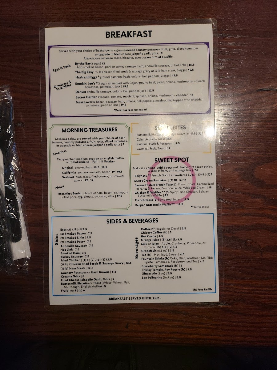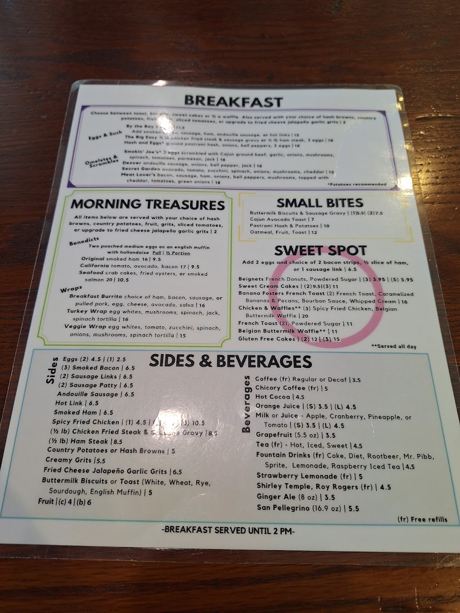 Culinary Highlights: Start your day off right with their Buttermilk Biscuits & Sausage Gravy, homemade biscuits generously smothered in creamy sausage gravy—an irresistible treat for just $7.50. If you're in the mood for something lighter, the Cajun Avocado Toast adds a sophisticated twist to tradition, featuring perfectly ripe avocado on sourdough toast, elegantly sprinkled with Cajun seasoning for a mere $8.50.